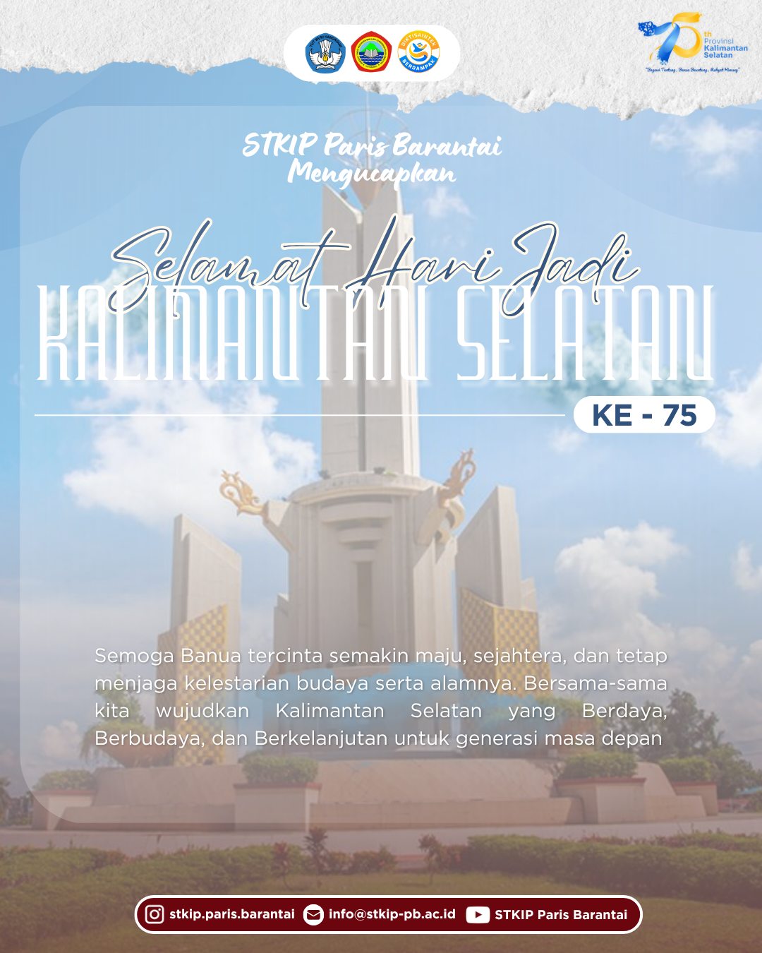 STKIP Paris Barantai mengucapkan selamat Hari Jadi ke-75 Provinsi Kalimantan Selatan. Dengan semangat kebersamaan, mari kita terus menjaga kelestarian budaya dan alam Banua tercinta, serta mendorong kemajuan dan kesejahteraan masyarakat.